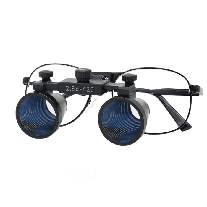 Glaslinsen mit 2,5-facher oder 3,5-facher Vergrößerung und einer Brennweite von 30 bis 42 Zentimetern.
