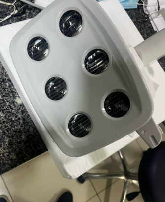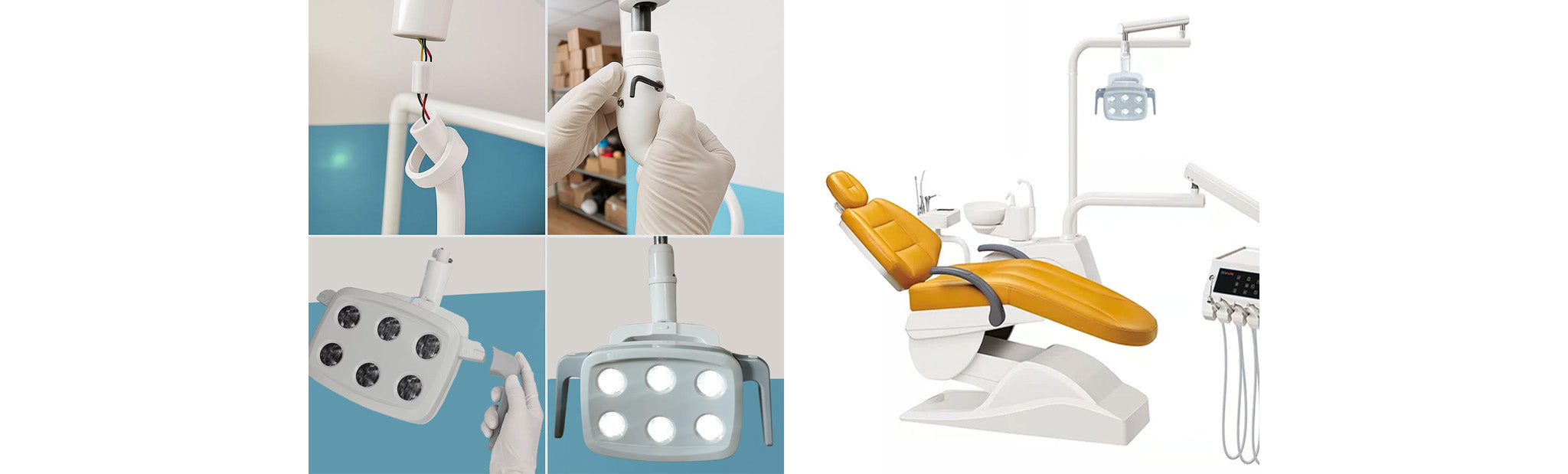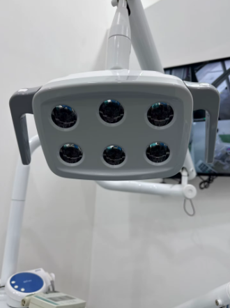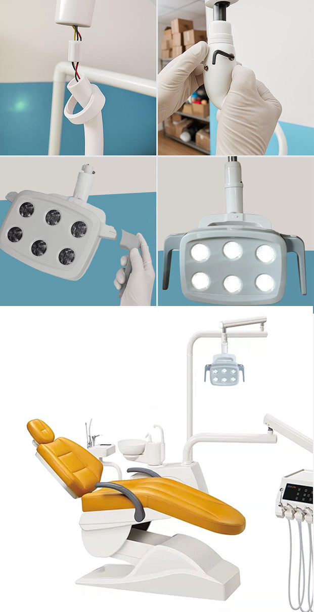 Stirnlampe LED mit 6 Leuchtpunkten mit Induktionssensorsteuerung, die eine einstellbare Beleuchtung zwischen 8.000-30.000 LUX bietet. Sie verfügt über eine Farbtemperatur von 4500K. Ideal für zahnärztliche Verfahren, mit doppelter Farbtemperatur-Einstellung und kontaktloser Bedienung.